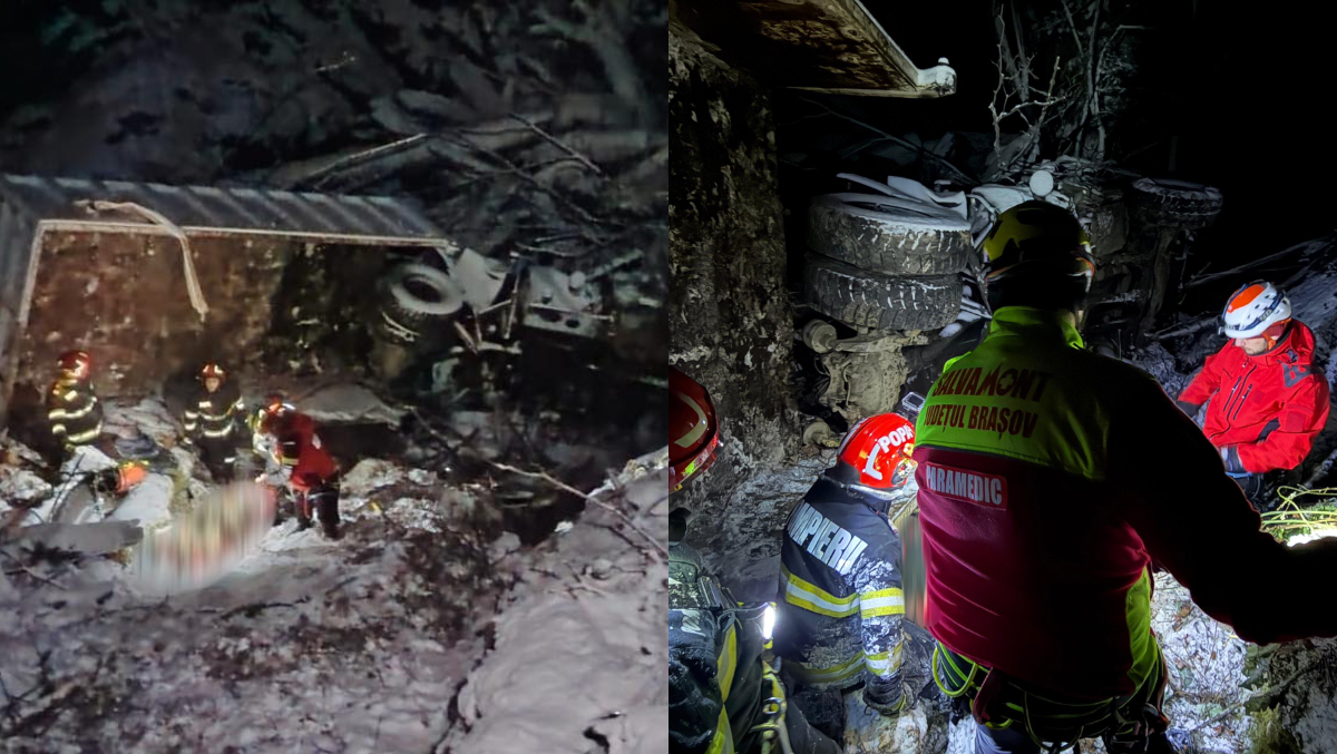 Incidentul tragic s-a produs marți seara, pe Valea Arpașu Mare din județul Sibiu. Autoritățile au fost informate că un autocamion care transporta lemne s-a răsturnat într-o râpă de pe un drum forestier. Salvamontiștii au transmis că a fost o noapte albă, condițiile meteo fiind extrem de dificile.
