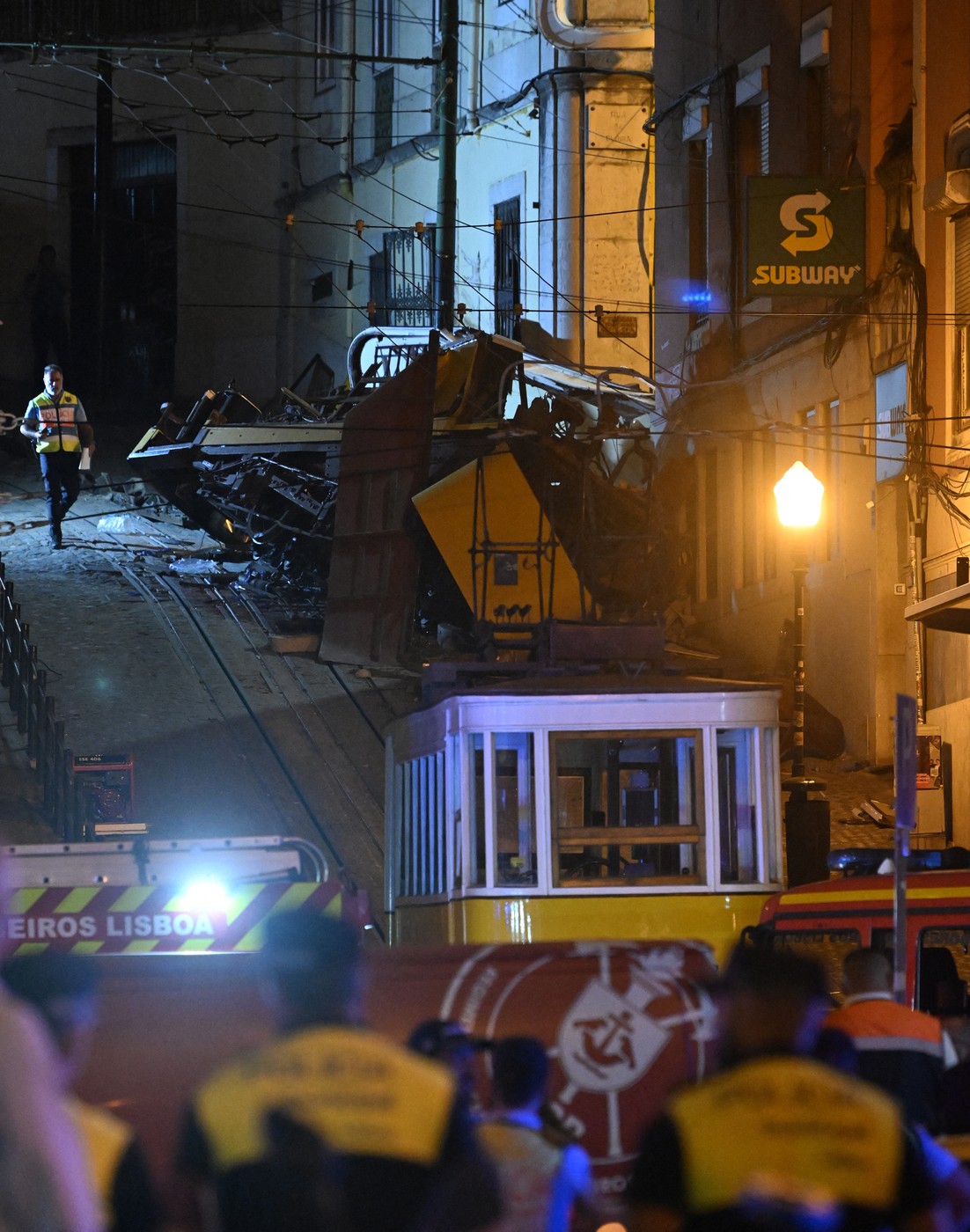 Imaginile surprinse la locul tragediei arată vagonul galben și alb, Elevador da Glória, răsturnat pe strada îngustă, după ce s-ar fi izbit de o clădire.