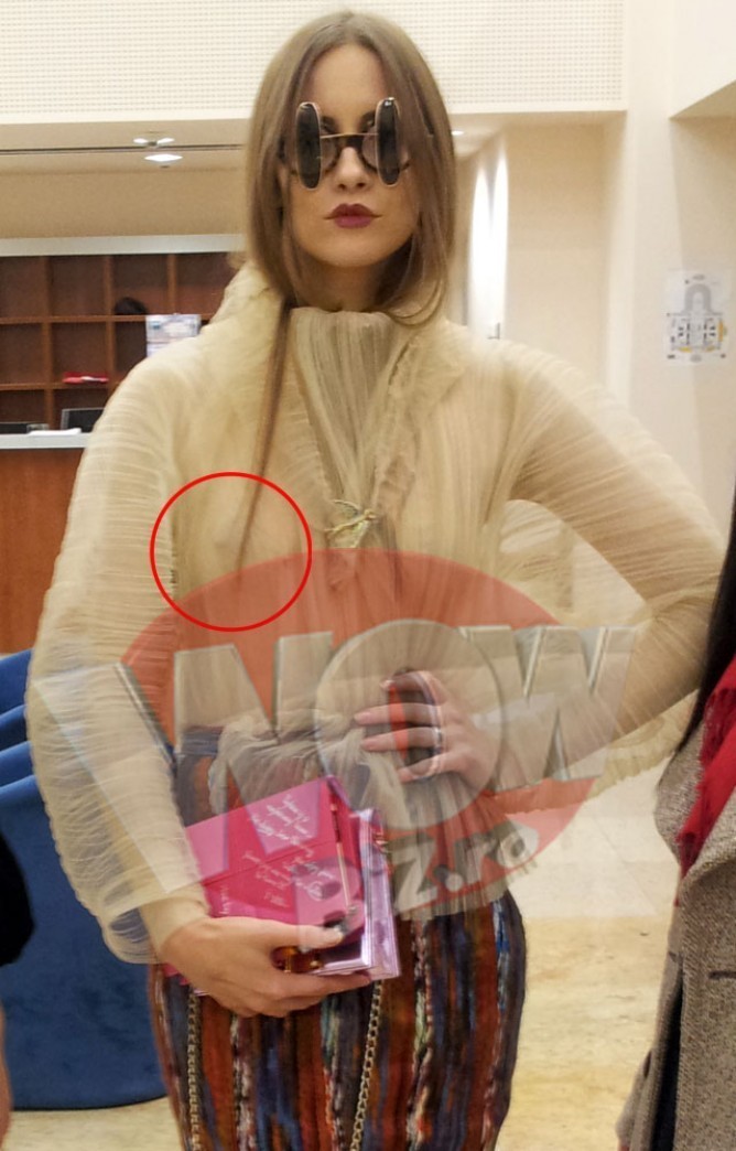 Asadar, pentru ca pe podium au defilat modele imbracate in ie traditionale, Iulia s-a echipat intr-o fusta pana la genunchi, un sort traditional si o bluzita extrem de trasparenta.