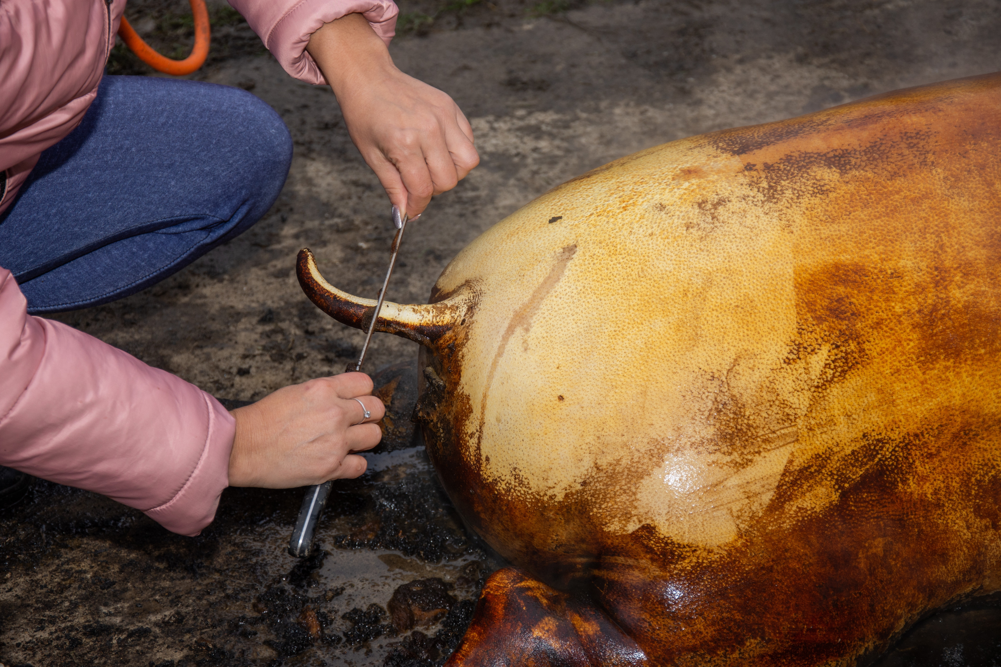 Tăierea porcului, conform tradiției din străbuni, se face prin înjunghiere, iar apoi animalul este pârlit, spălat cu mălai și acoperit cu o pătură.