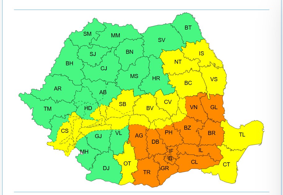 Se vor acumula cantități de precipitații de 25-30 litri/mp.Până joi, la ora 10:00, sunt în vigoare mai multe coduri de vreme deosebit de rece. Sunt așteptate precipitații, intensificării ale vântului, dar și polei, ghețuș și intensificări ale vântului.