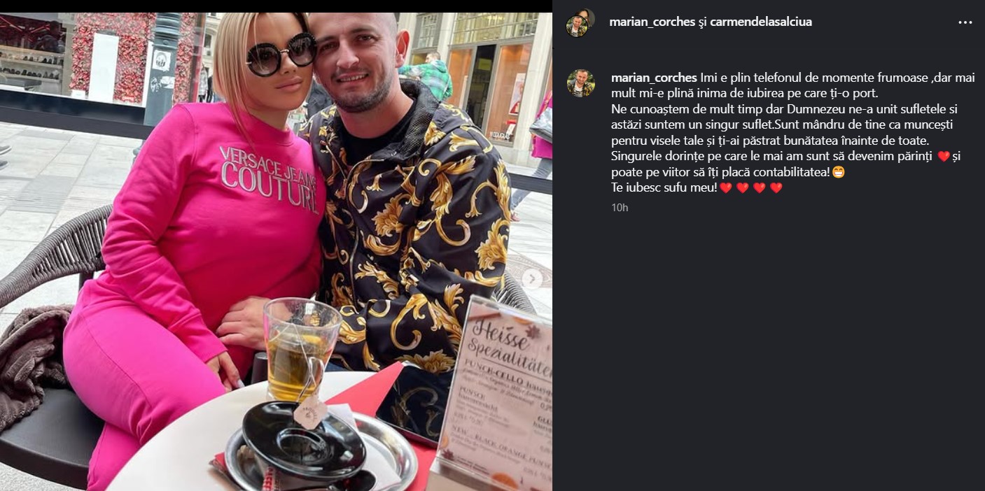 În postarea pe care a făcut-o pentru soția lui, Marian Corcheș a atașat o fotografie cu ei doi, în timp ce savurau un ceai la terasă. În respectiva imagine, Marian și Carmen au fost surprinși în ipostaze tandre, stând îmbrățișați și bucurându-se că petrec momente frumoase unul alături de celălalt.